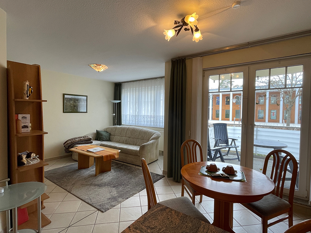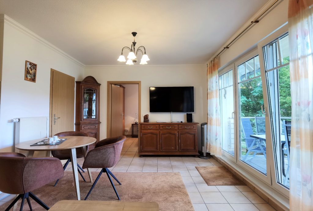 Wohnraum mit Fliesenboden und Westbalkon