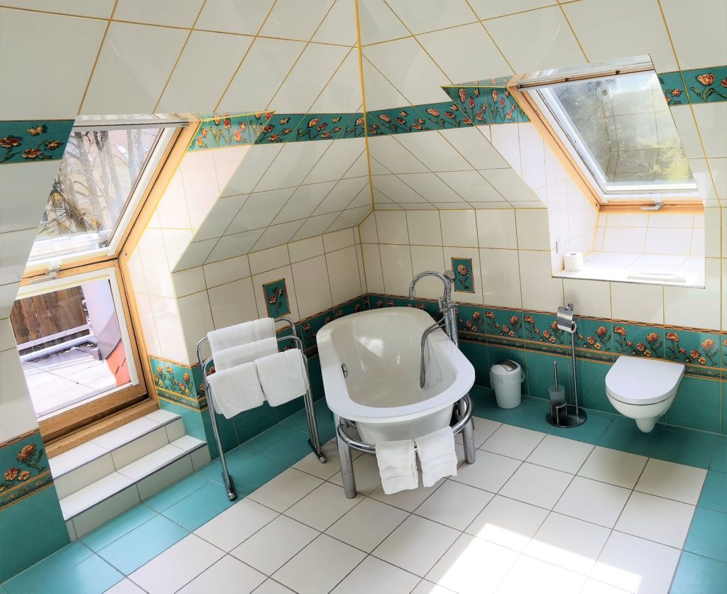 luxuriöses Bad mit Dusche, freistehender Wanne & separatem Sonnenbalkon ▪ Waschmaschine & Trockner ▪ Kosmetikspiegel ▪ Fön